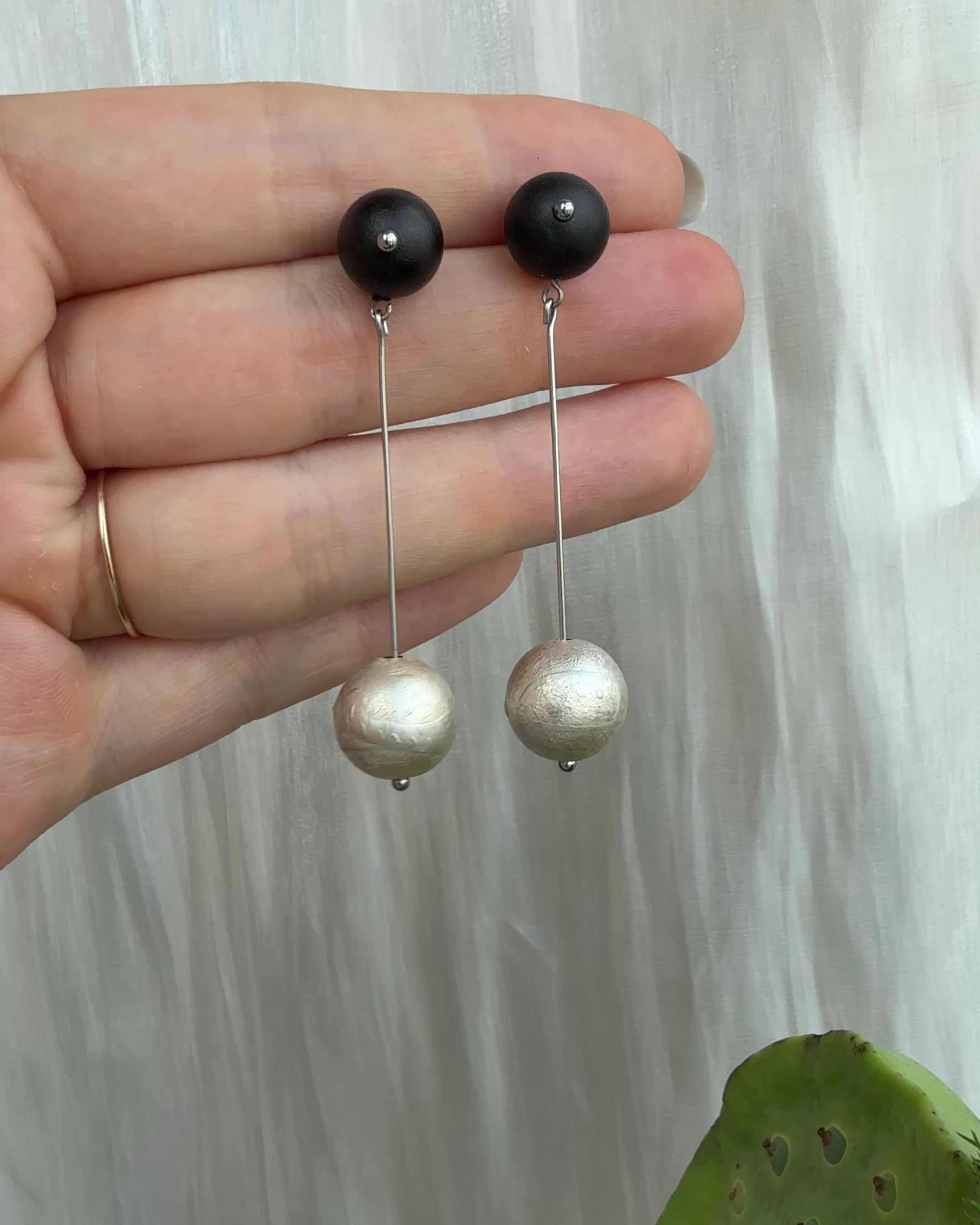 Inspired by the Eastern blessing of “abundance and prosperity,” these lacquered earrings reinterpret Chinese traditional motifs through minimalist form. Each rounded bead is hand-painted with pure silver quasi-maki-e, where delicate fish glide across the surface — simple, lively, and full of quiet grace.